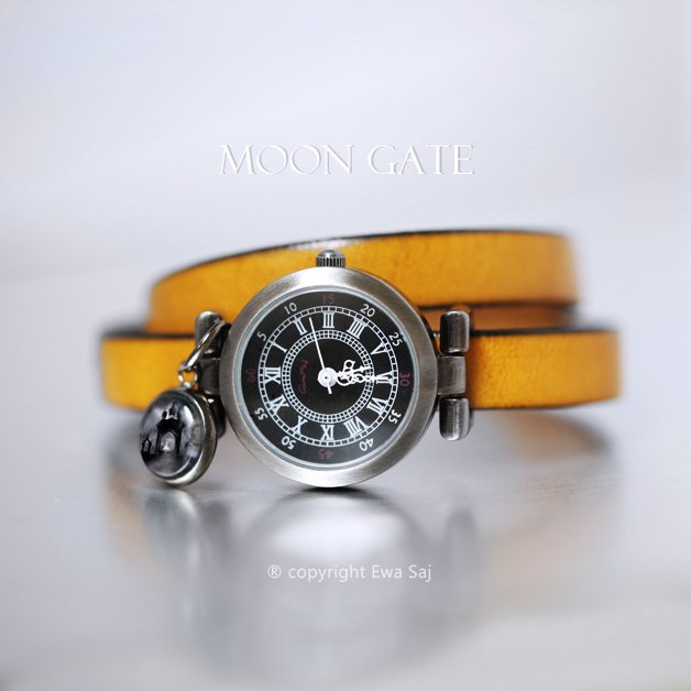 Oryginalna bransoletka - zegarek z kolekcji Moon Gate. Skórzany rzemyk w kolorze żółtym szeroki na10 mm dwukrotnie owija nadgarstek. Wielkość tarczy zegarka 25 mm, średnica charmsa 12 mm. Zapięcie, charms i zegarek w kolorze antycznego srebra. Tarcza sygnowana moim podpisem. Zegarek posiada mechanizm kwarcowy i wymienną baterię. Idealna na nadgarstek 14,5 - 15,5 cm. Potrzebujesz inny rozmiar? Napisz.