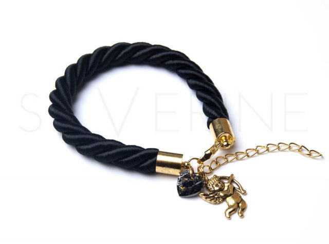 Bransoletka wykonana z satynowego skręcanego sznurka w kolorze czarnym z pozłacaną zawieszką w kształcie amorka oraz serduszkiem marki Swarovski Elements w kolorze Silvernight.