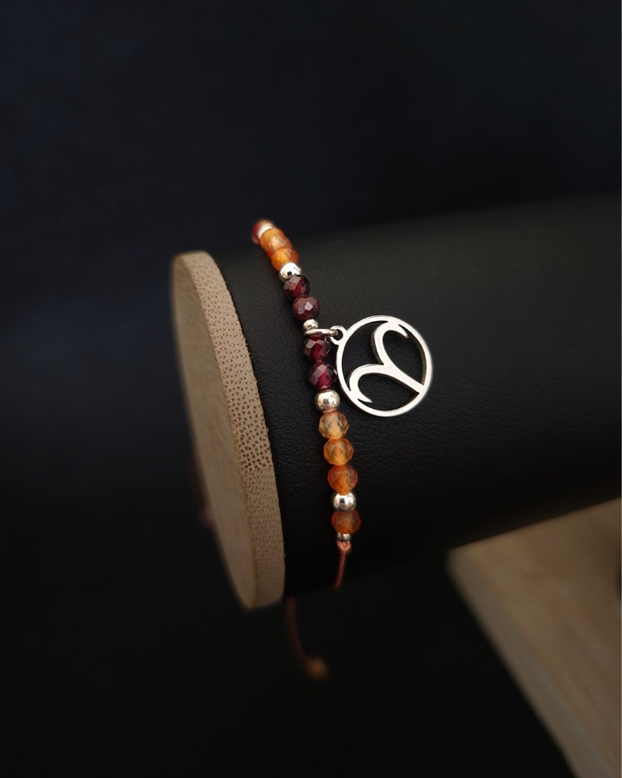 Połączenie karneolu i granatu odpowiada energii, śmiałości i żywiołowości Barana, podczas gdy hematyt wprowadza niezbędną równowagę i spokój. Wizualnie bransoletka odzwierciedla dokładnie to, czym jest Baran — siłą, pewnością siebie i wewnętrznym płomieniem.