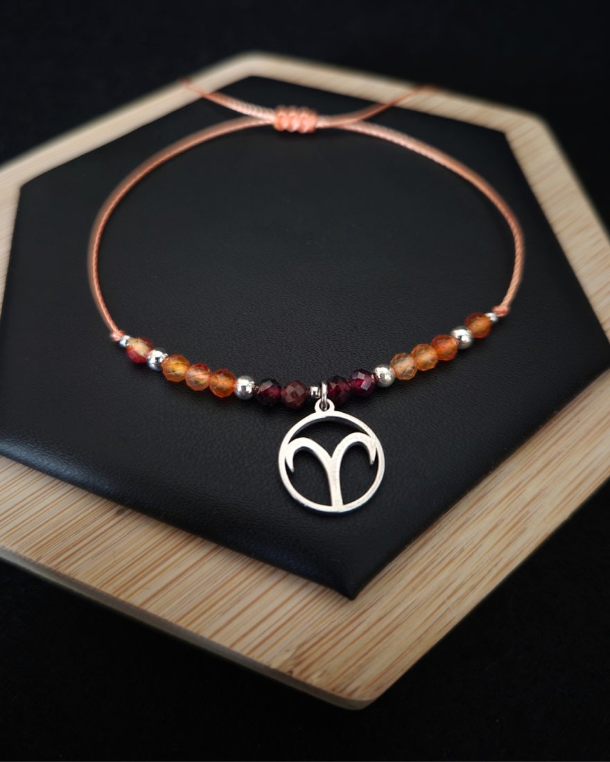 Bransoletka Zodiakalna "Baran" to energetyczna kompozycja stworzona z myślą o osobach urodzonych pod znakiem Barana — odważnych, pełnych pasji, spontanicznych i gotowych do działania. Jej ognista kolorystyka, łącząca głębokie odcienie granatu z ciepłymi tonami karneolu, odzwierciedla żywioł Ognia, którym Baran kieruje się w życiu. Elementy srebra i połysk hematytu dodają całości elegancji, równowagi i symbolicznego uziemienia. Zawieszka ze stali nierdzewnej z symbolem Barana podkreśla indywidualny charakter tej bransoletki, czyniąc ją osobistym talizmanem mocy.