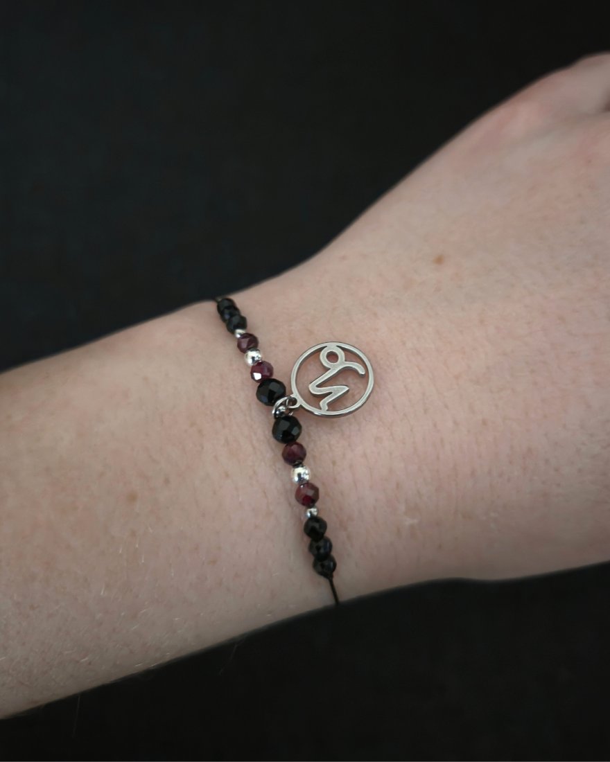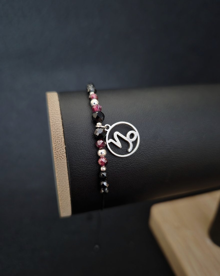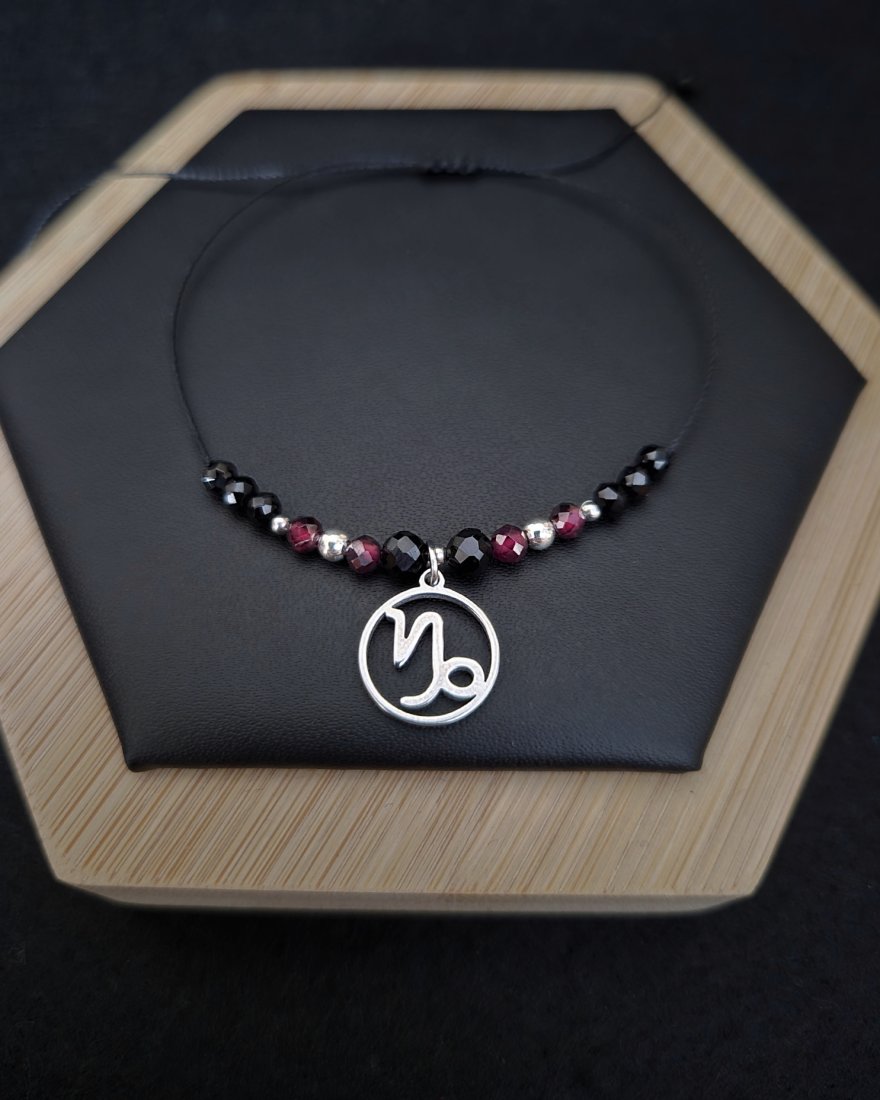Bransoletka Zodiakalna "Koziorożec" to wyrazista, skoncentrowana kompozycja stworzona z myślą o osobach urodzonych pod znakiem Koziorożca — ambitnych, zdyscyplinowanych, wytrwałych i konsekwentnie dążących do swoich celów. Głęboka czerń kamieni przełamana bordowym akcentem granatu oraz złotymi detalami tworzy elegancką, silną całość, która doskonale odzwierciedla powagę i wewnętrzną siłę tego znaku. Srebrna zawieszka z symbolem Koziorożca nadaje bransoletce charakter osobistego talizmanu determinacji i stabilności.