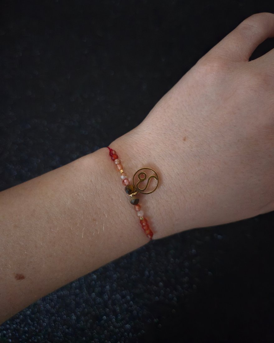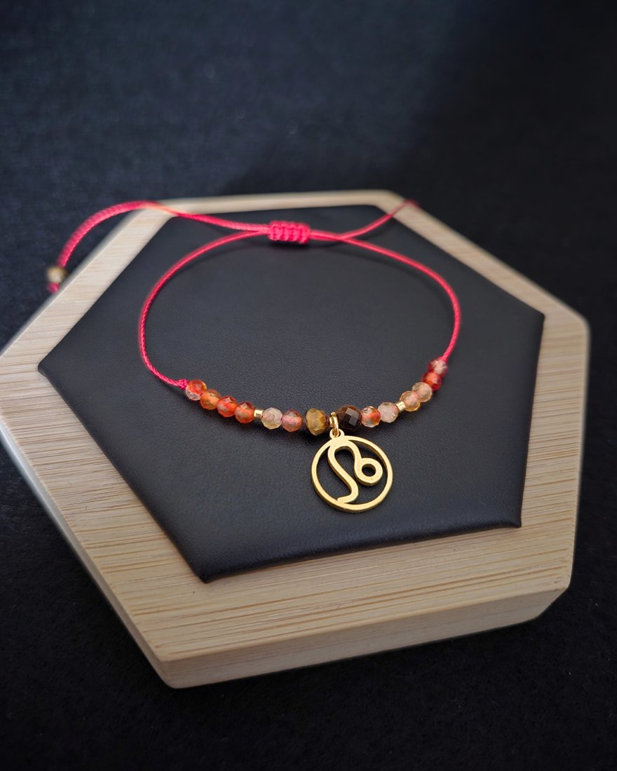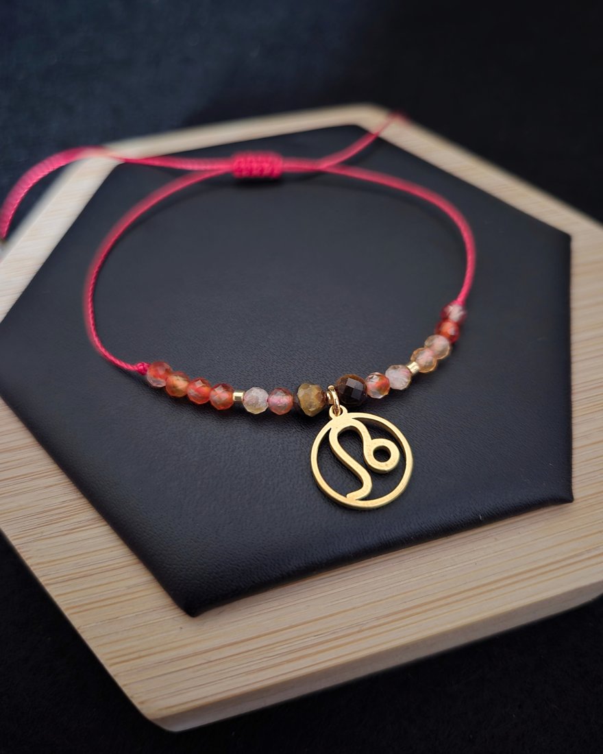 Bransoletka Zodiakalna "Lew" to wyrazista, pełna energii kompozycja stworzona z myślą o osobach urodzonych pod znakiem Lwa — charyzmatycznych, pewnych siebie, kreatywnych i odważnych. Ognista paleta barw: ciepłe złoto, intensywna czerwień i bursztynowe odcienie kamieni doskonale oddają naturalny blask i siłę tego znaku. Złota zawieszka z symbolem Lwa podkreśla jego królewski charakter, czyniąc z bransoletki osobisty talizman mocy i pewności siebie.