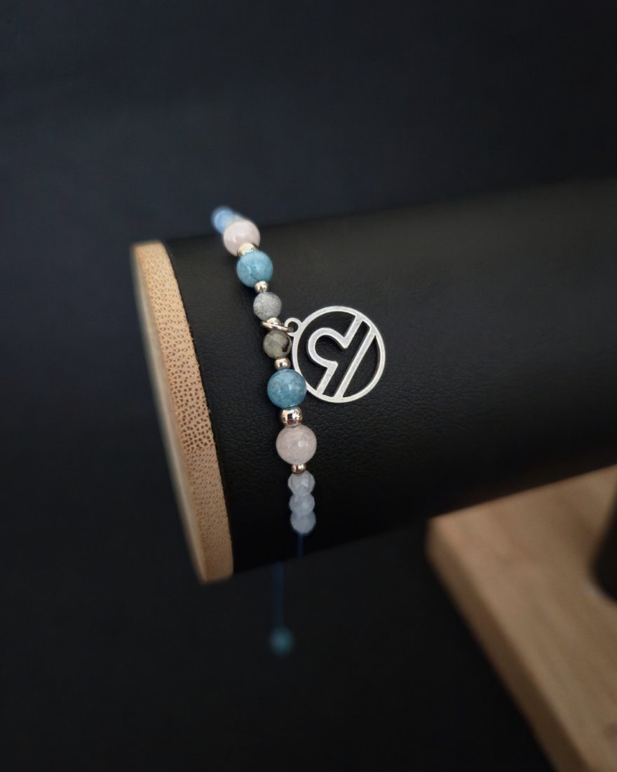 Akwamaryn wprowadza spokój i emocjonalną równowagę, kwarc różowy wzmacnia energię miłości i empatii, a labradoryt zapewnia ochronę i wspiera intuicję. Jasna, pastelowa kolorystyka podkreśla delikatność, elegancję i harmonijną naturę Wagi.