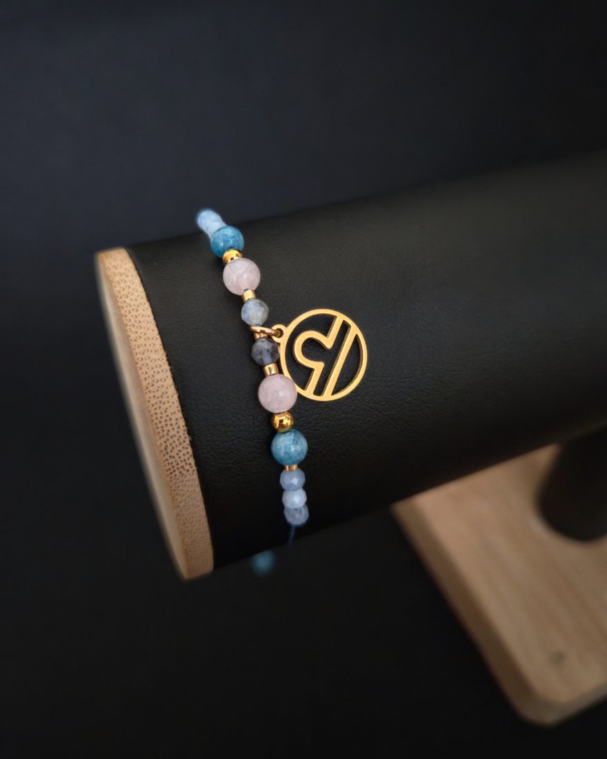 Akwamaryn wprowadza spokój i emocjonalną równowagę, kwarc różowy wzmacnia energię miłości i empatii, a labradoryt zapewnia ochronę i wspiera intuicję. Jasna, pastelowa kolorystyka podkreśla delikatność, elegancję i harmonijną naturę Wagi.