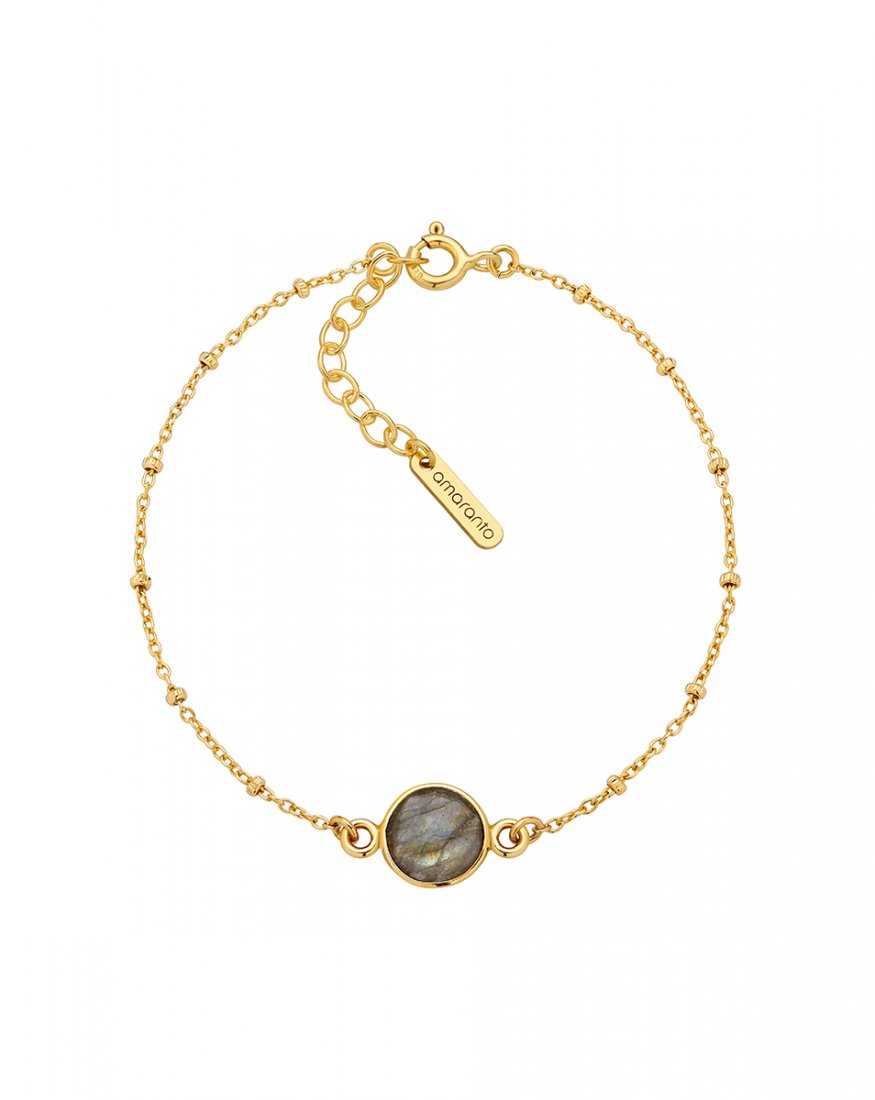 Elegancka bransoletka Zoe z labradorytem ozdobiona jest drobnymi złotymi elementami i dużą monetą z labradorytu w złotej oprawie. Labradoryt, znany jako kamień intuicji i ochrony, subtelnie odbija światło, ukazując niesamowite refleksy w odcieniach szarości, niebieskiego i zieleni. Połączony ze złotymi detalami, tworzy luksusowy, minimalistyczny dodatek, który przyciąga spojrzenia i podkreśla indywidualny styl.