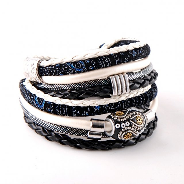 Bransoletka zwijana podwójnie wokół nadgarstka wykonana z wielu rzemyków ze skóry ekologicznej, z weluru zdobionego w orientalne wzory, plecionych i miękkich rzemyków