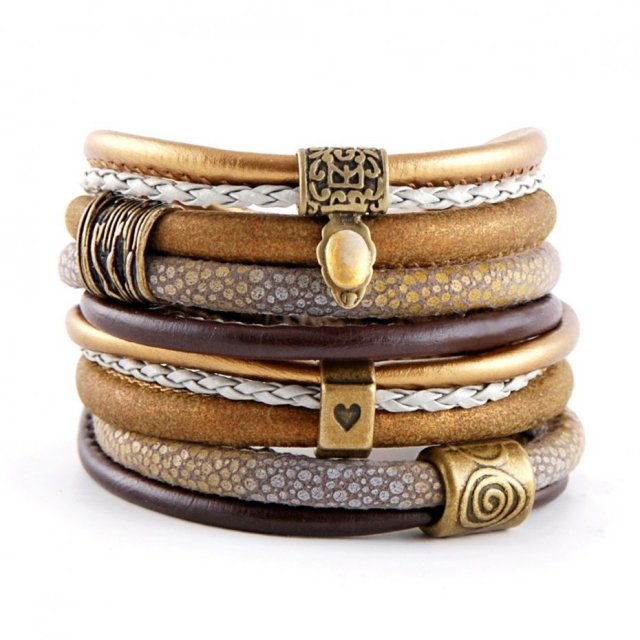 Bransoletka zwijana podwójnie wokół nadgarstka wykonana z wielu rzemyków ze skóry ekologicznej - plecionych oraz miękkich przecieranych na złoto lub nakrapianych cętki.