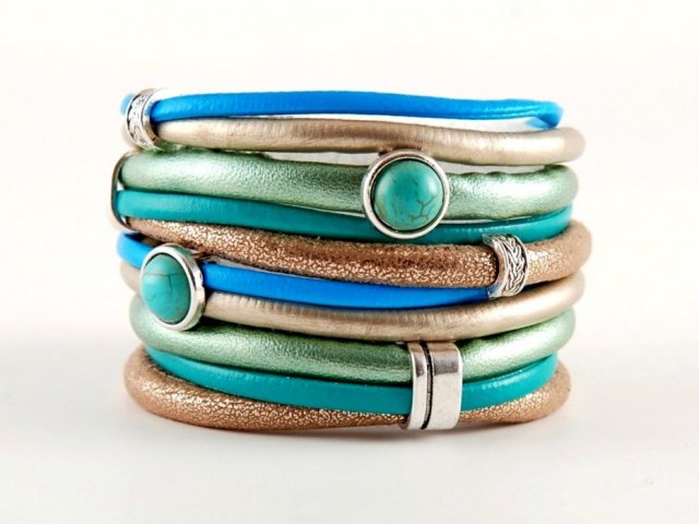 Ta śliczna bransoletka została wykonana z efektownych rzemieni jubilerskich w kolorach: miętowym, niebieskim, morskim, beżowym i złotym.