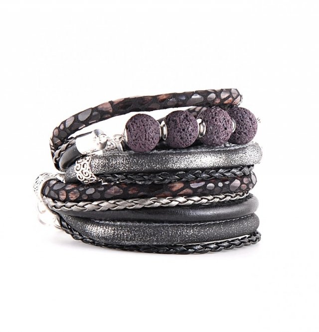 Niezwykła, efektowna bransoletka łącząca w sobie wygodę i elegancję. Bransoletka stanowi jedną formę - złożoną z rzemieni oraz kul z lawy wulkanicznej w ciekawym kolorze marengo ( z lekkim odcieniem fioletu).