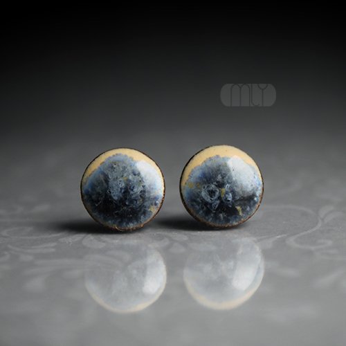 Ceramiczne, lekko nieregularne kolczyki w formie sztyftów, ręcznie wykonane z delikatnej gliny kamionkowej, jednostronnie szkliwione efektowną mieszanką błyszczących beżowo kremowych i szarych szkliw z efektem plamek, na antyalergicznych sztyftach w kolorze srebrnym.Średnica ok. 9mm. Polecam