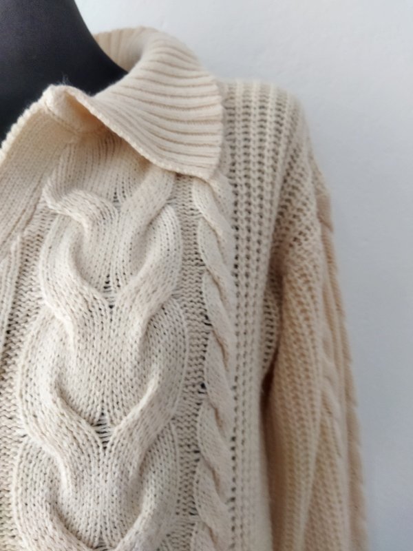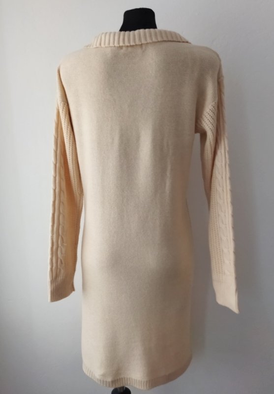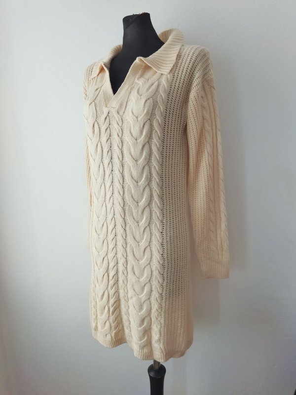 Ładna sukienka z akrylowej włóczki w waniliowym kolorze wykonana różnymi ściegami z dominacją warkoczowych wzorów. Miła, mięciutka wygodna w noszeniu.