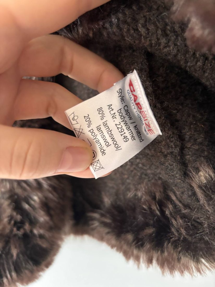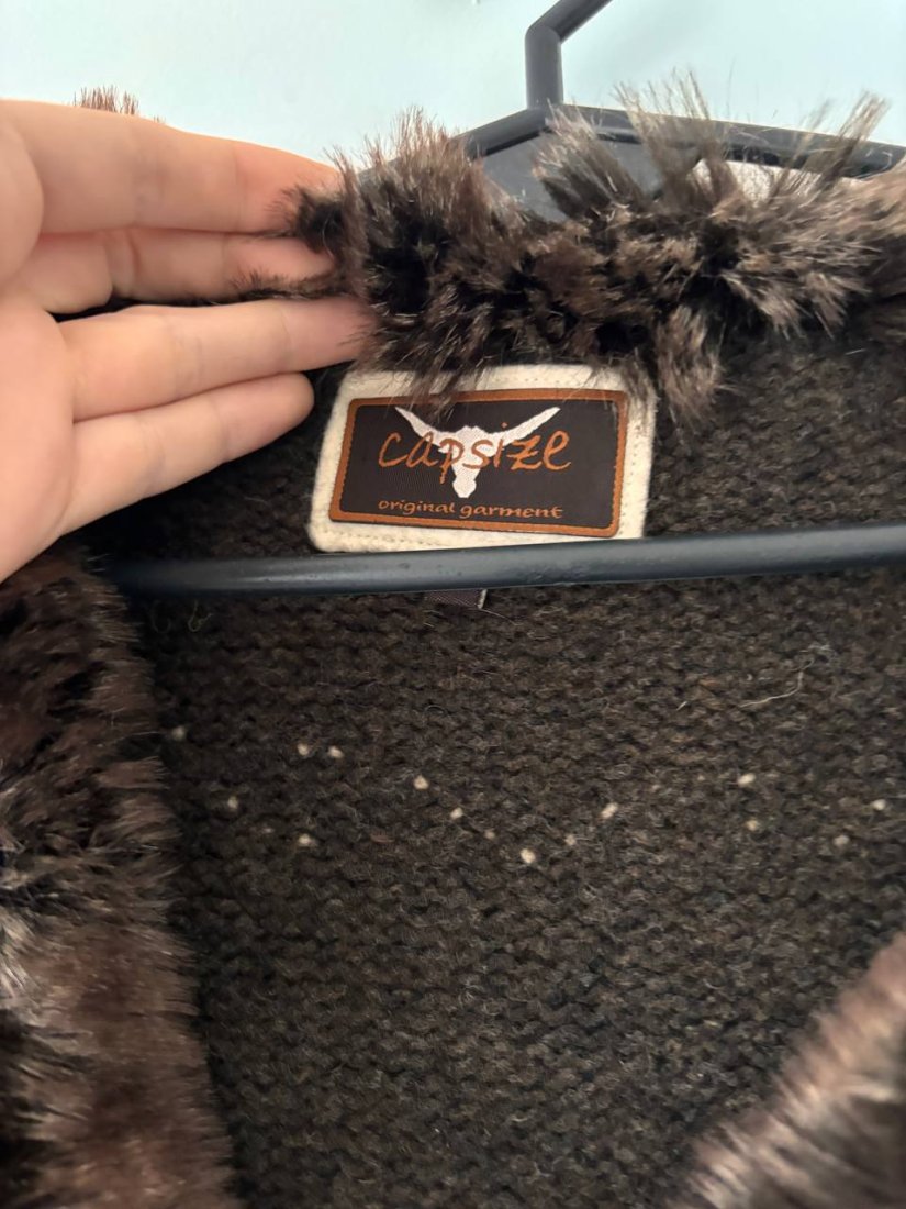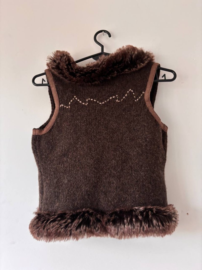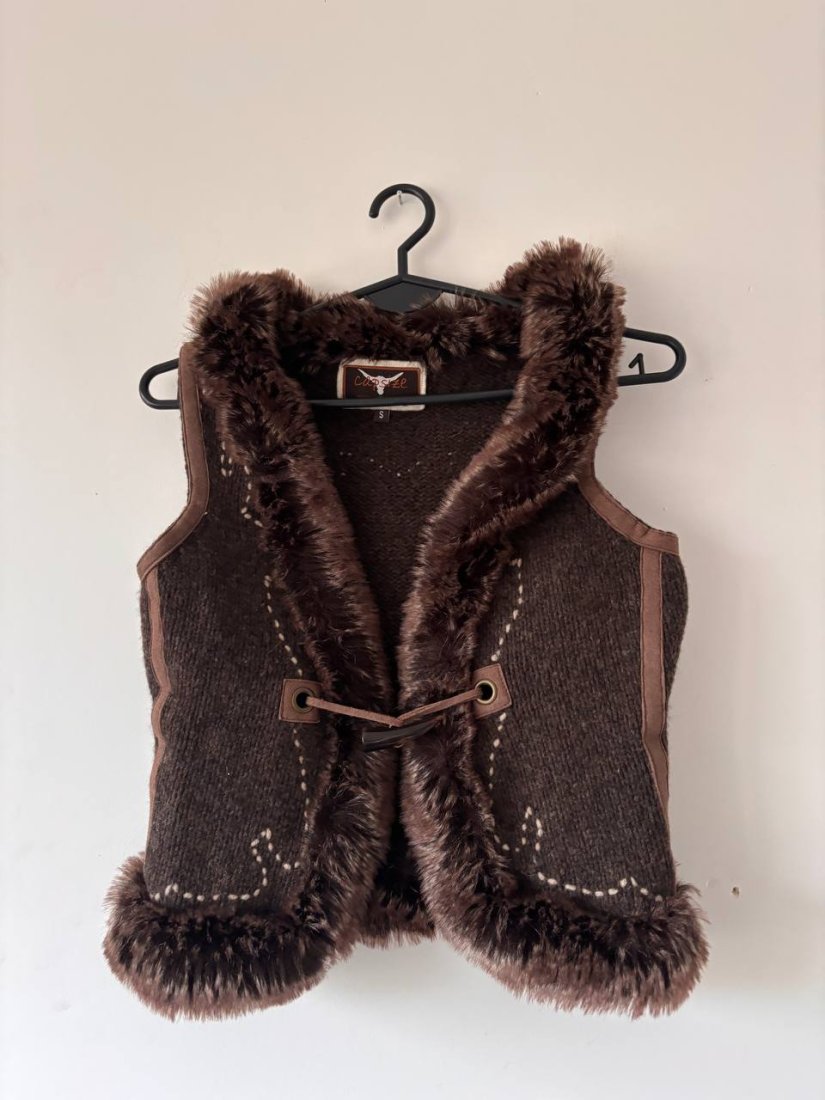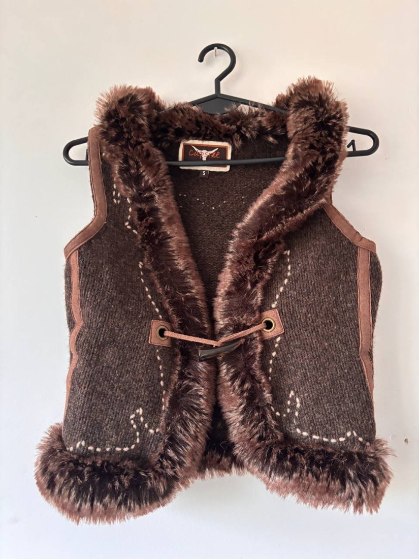 faux fur vest, winter vest, brown vest, wool vest, lambswool, warm vest, boho vest, rustic vest, cozy vest, women’s vest, sleeveless jacket, faux fur trim, vintage style, soft vest, warm clothing, winter fashion, short vest, brown clothing, boho clothing, rustic style, winter outfit, layering piece, warm outerwear, brown faux fur, cozy fashion, Capsize vest, size S, wool blend, fluffy vest, soft winter vest