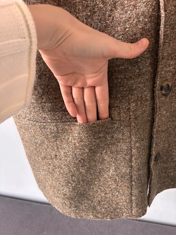 Model klasyczny, zapinany na guziki, z dwiema praktycznymi kieszeniami z przodu. Naturalny, melanżowy brąz pasuje zarówno do stylizacji casual, jak i bardziej eleganckich.