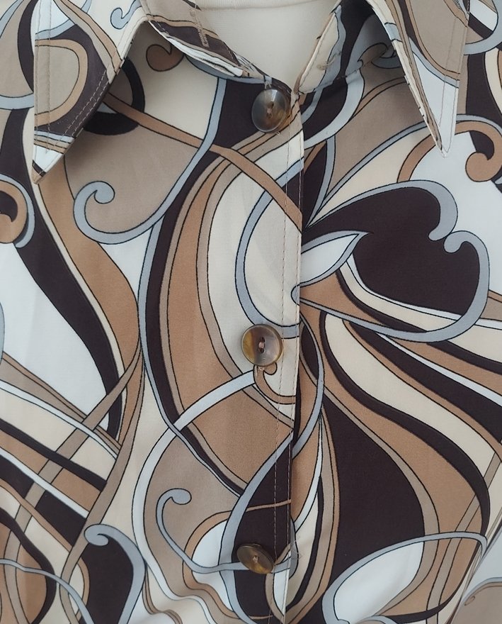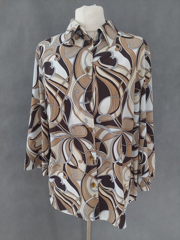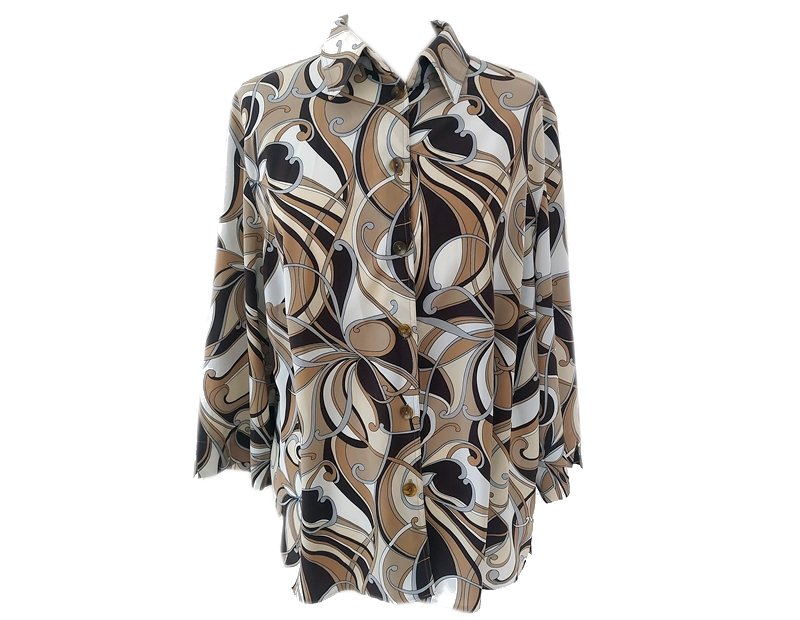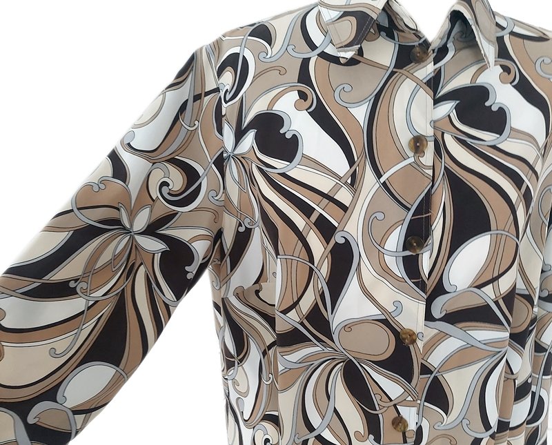 Tę koszulę można elegancko połączyć z brązem, beżem, bielą lub szarością. Stonowane, klasyczne kolory oraz abstrakcyjny wzór sprawiają, że jest wyjątkowo oryginalna i przyciąga wzrok. Rękaw 3/4 nadaje jej swobodny i wygodny krój.