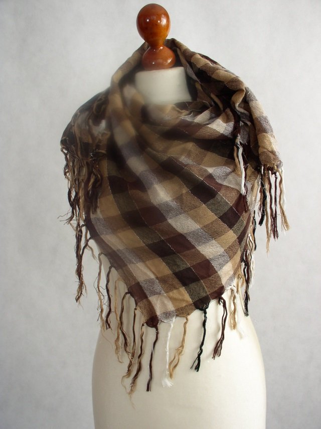 Duża chustka w kratę w trzech odcieniach brązu.Kratki oddzielone srebrną nitką.Brzegi wykończone frędzlami.Brak metki.Materiał wygląda na bawełnę łączoną z syntetykiem.Stan bardzo dobry-.Długość boków bez frędzli 96 cm.