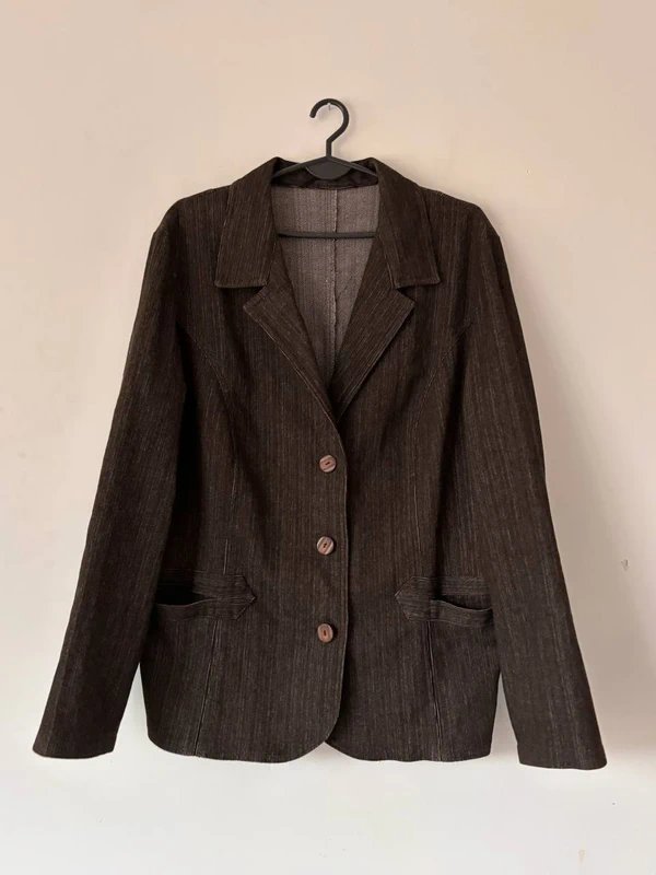 Elegancka brązowa marynarka w delikatny prążek, wykonana z miękkiego materiału o strukturze przypominającej len.