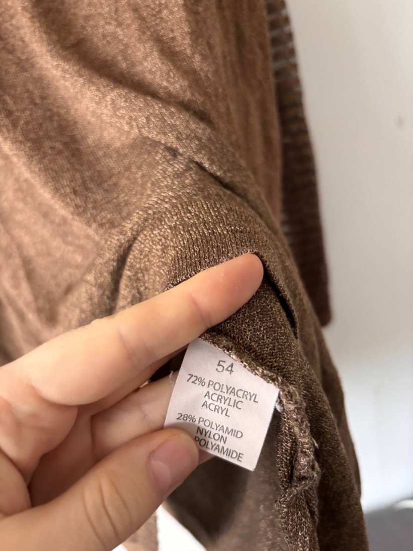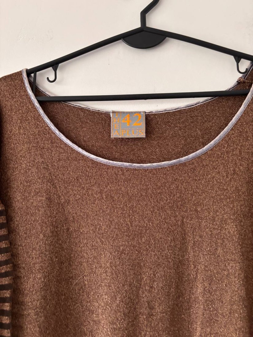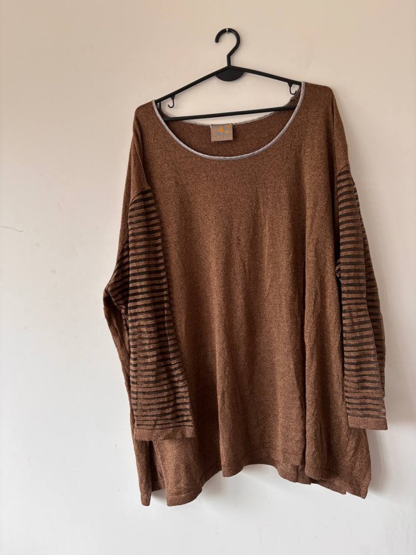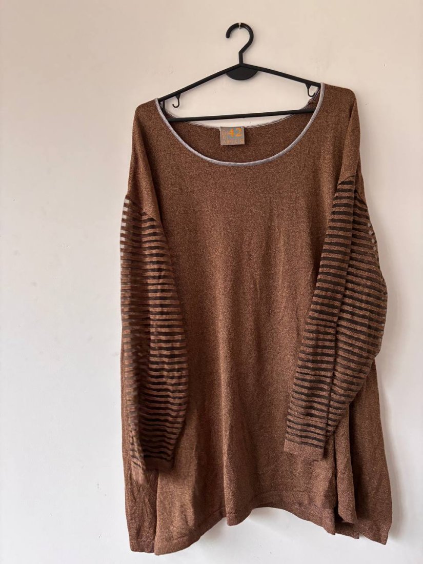 Bluzka ma oversize’owy krój, głęboki brązowy kolor oraz pasiaste rękawy, które dodają jej charakteru. Idealna do jeansów, legginsów lub codziennych stylizacji.