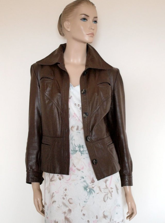 szwedzka kurtka vintage z naturalnej skóry, w kolorze tabakowego brązu. Stan bardzo dobry, minimalne ślady użytkowania ( w kilku miejscach mogą być mini zadziorki jak od kociego pazurka-zdjęcie). skóra średnio miękka. Rozmiar z metki włoskie 44, ale to najwyżej 38. Podaję wymiary mierzone na płasko;