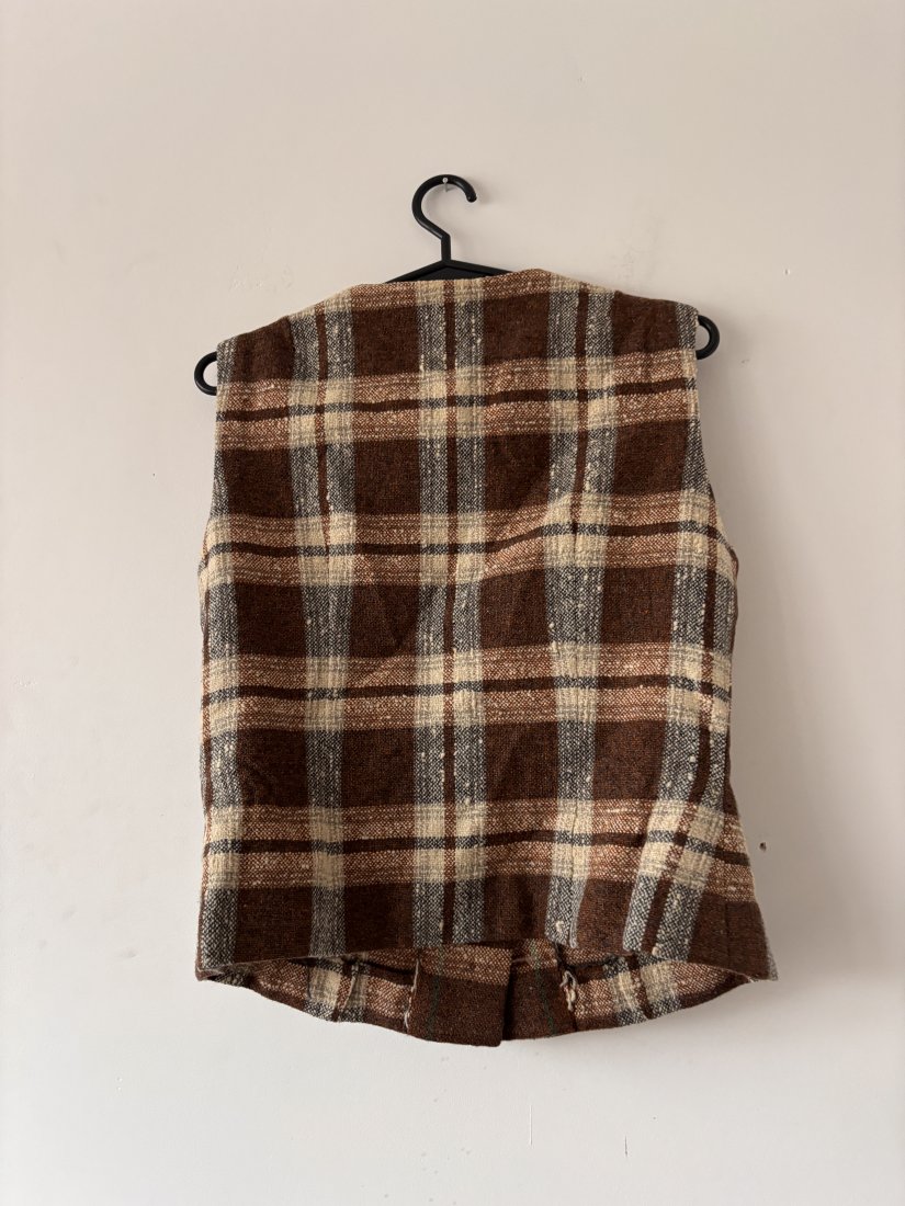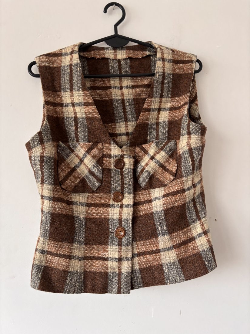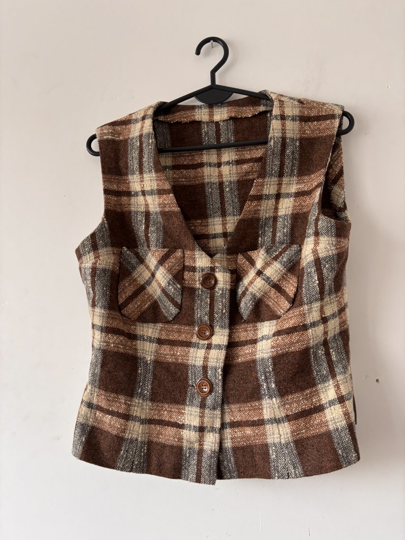 Vintage’owa brązowa kamizelka w klasyczną kratę, zapinana na duże drewniane guziki. Model z dwoma kieszeniami z klapkami, wykonany z miękkiej, grubszej tkaniny przypominającej tweed. Pięknie trzyma formę, idealna na jesień i zimę jako warstwa na sweter lub koszulę.