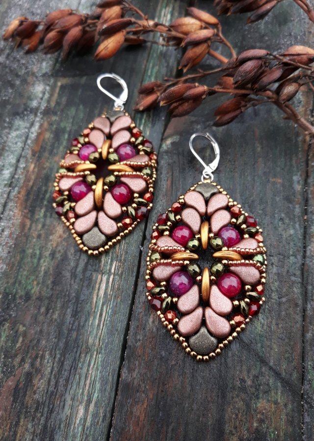 ,,brązowe,, to niezwykle kobiece ażurowe kolczyki utrzymane w kolorystyce brązu, wykonane z różowego turmalinu i szklanych koralików i kryształków w różnych odcieniach brązu, złota i czerwieni. Kolczyki zawieszone są na ozdobnych biglach typu angielskiego wykonanych ze stali szlachetnej.