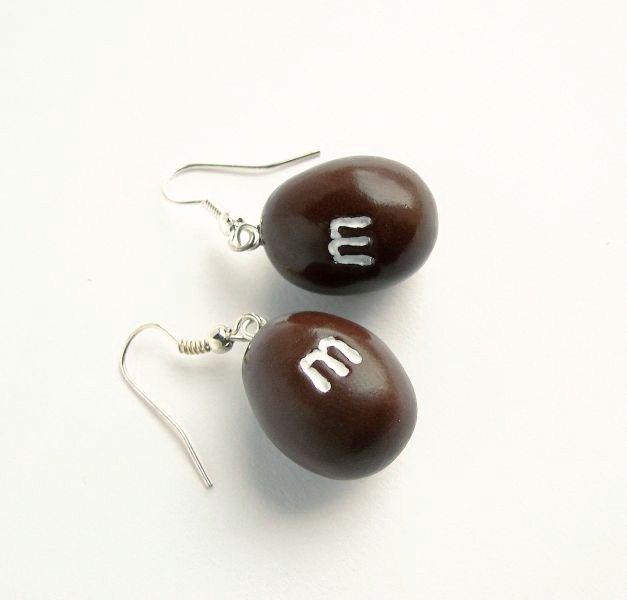 Przedmiotem sprzedaży są znane orzeszki w czekoladzie m&m wykonane ręcznie z masy fimo. Wielkość cukierka 2,5 cm, bigle w kolorze srebrnym
