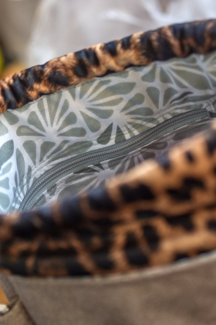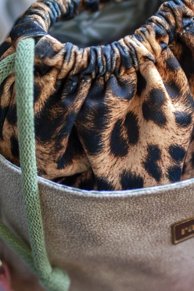 Wykonana z weluru w panterkę. Z przodu oraz z na tyle torebki kieszenie (np. na telefon czy chusteczki) z beżowego weluru. W środku kieszonka zapinana na suwak.