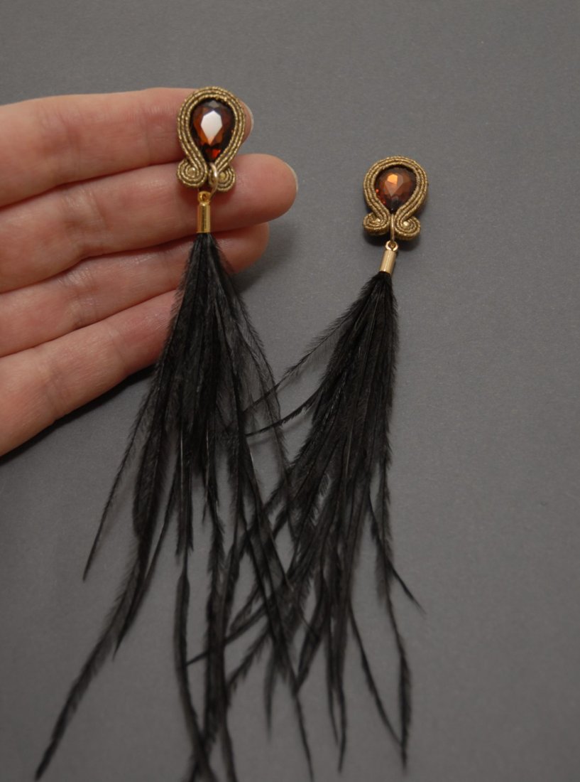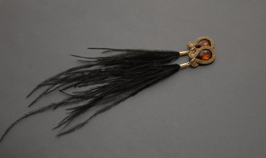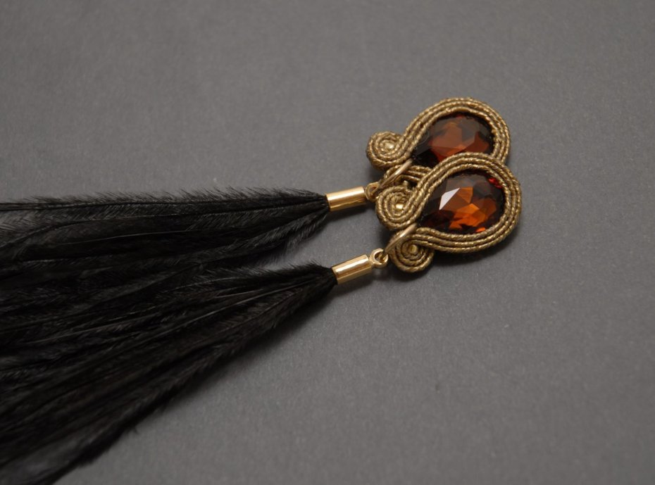 BRĄZOWO-CZARNE KOLCZYKI SUTASZ Z PIÓRAMI