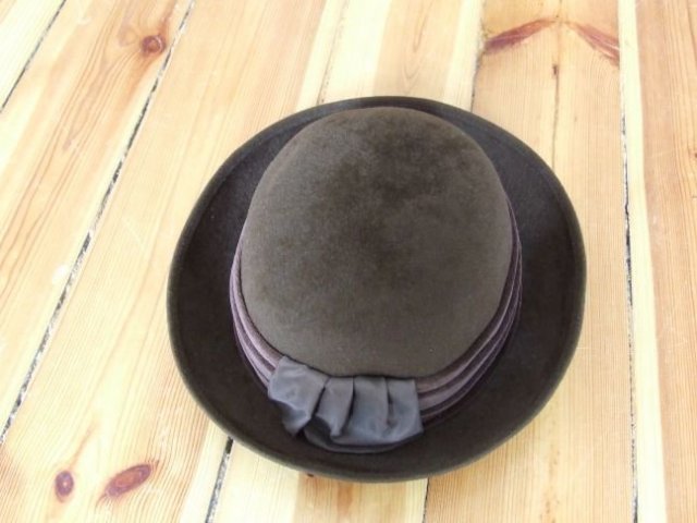 fajny wełniany kapelusik dla damy ozdobiony wokół ronda welurem. Obwód: 61 cm (mierzony na zewnątrz). Stan bdb