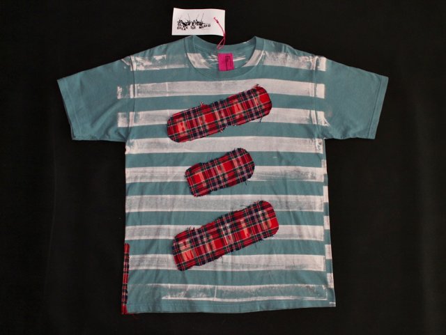 Wzór w pasy z efektownymi naszywkami materiałowymi.