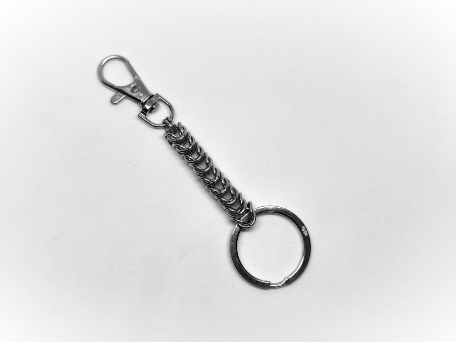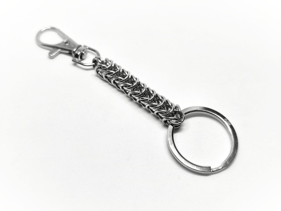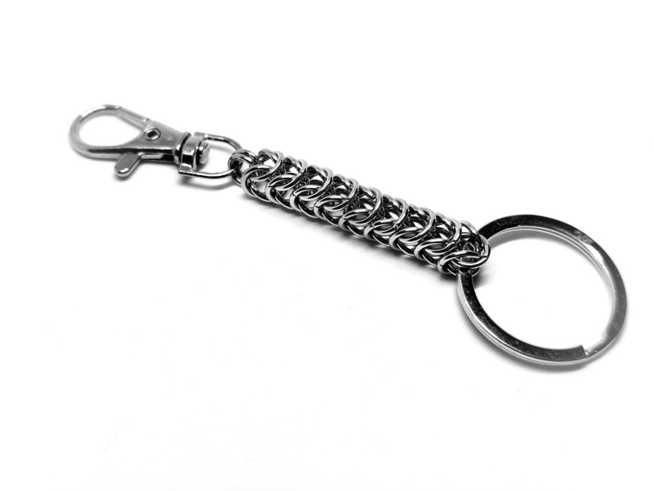 Przedstawiam breloczek wykonany w technice chainmaille – klasyczny, masywny łańcuch, splatany ręcznie z solidnych stalowych pierścieni. Zero delikatności, zero kwiatków – tylko czysty metal, moc i klimat ciężkiego grania.