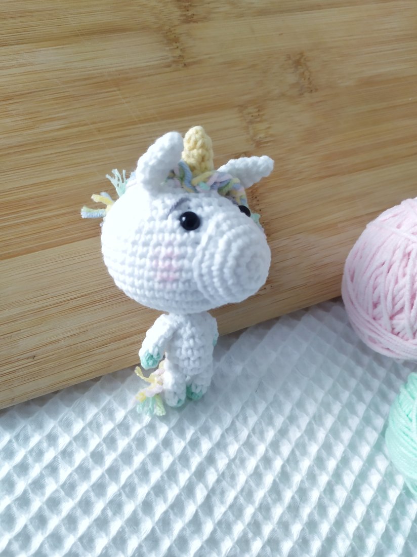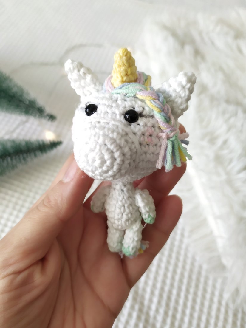 Jednorożęc, którego oglądasz jest wyjątkowy - wykonany na podstawie opracowanego przeze mnie wzoru. Jest wykonany z włóczki, która jest mieszanką bawełny i akrylu - pamiętaj, żeby nie miała styczności ze źródłem ognia. Mieszanka ta da gwarancję bezproblemowego prania. Szczegóły prania przekażę Ci razem z jednorożcem w przesyłce.