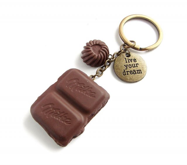 Apetyczny breloczek do kluczy lub torebki z kawałkiem czekolady milka i malą pralinką wykonanymi z masy termoutwardzalnej fimo oraz metalowa zawieszka "live your dream"