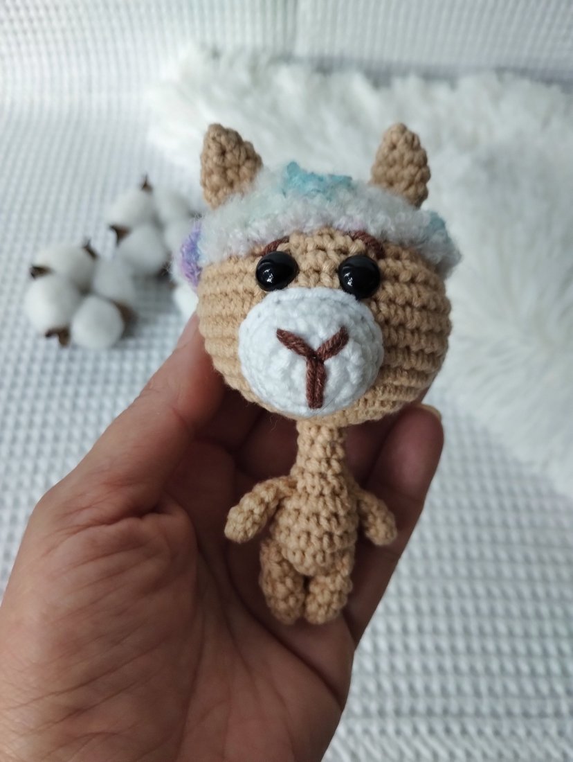 A lama mimo, że nie jest wielka, wszystko ma na swoim miejscu ;) sympatyczną mordkę, puchatą główkę i beżowe ciałko. Jej wielkość to ok 11 cm (razem z uszkami)+ łańcuszek i kółeczko.