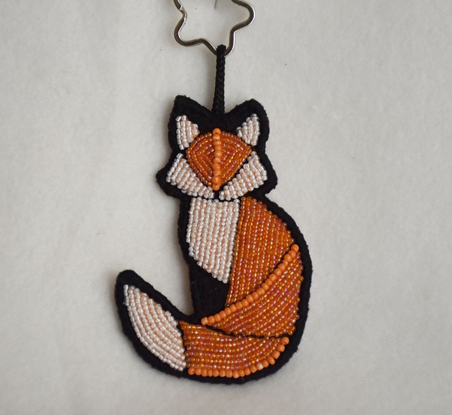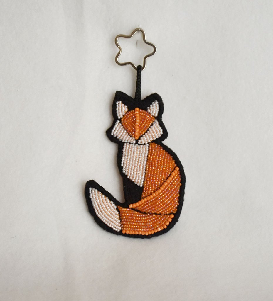 Ręcznie wykonany breloczek w kształcie lisa, misternie wyszywany drobnymi koralikami. Każdy element został wykonany z dużą precyzją, dzięki czemu breloczek jest niepowtarzalny i wyjątkowy.