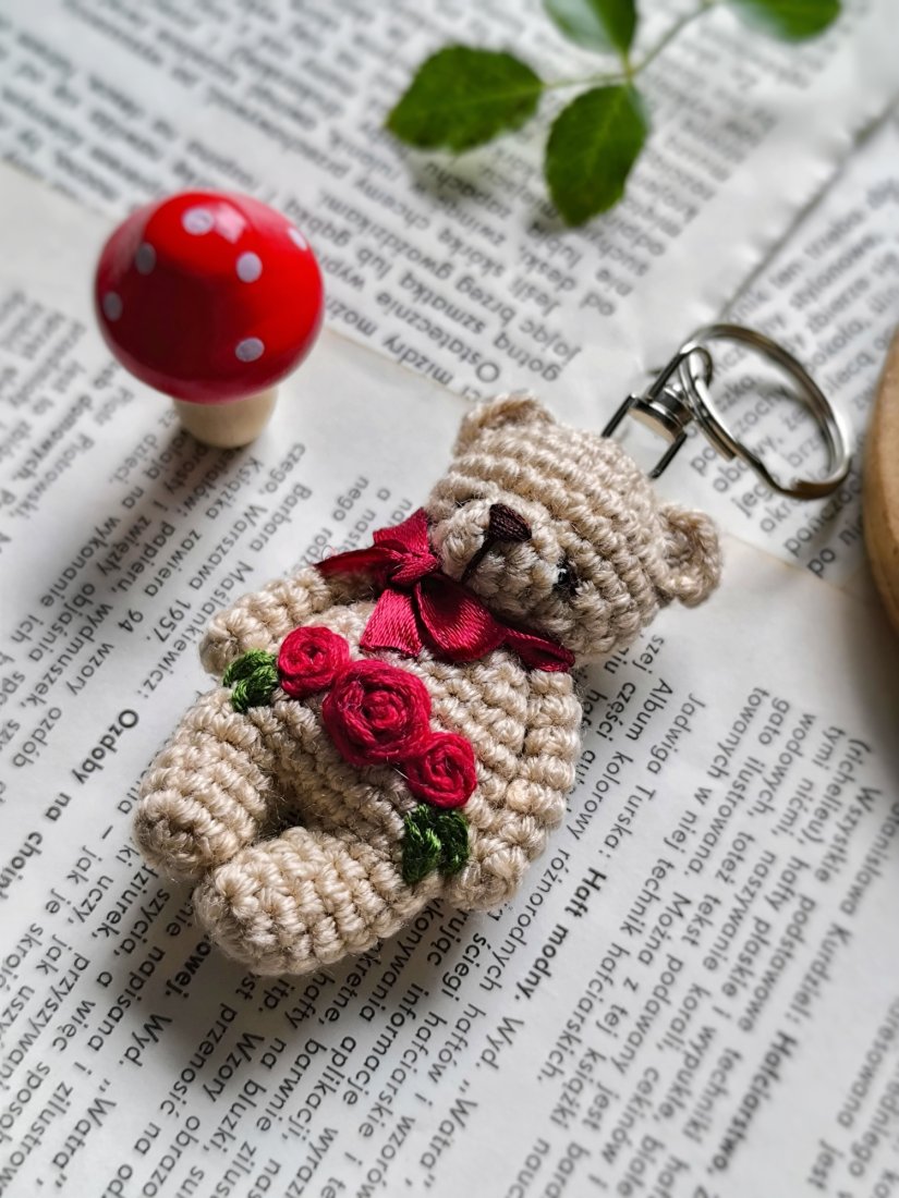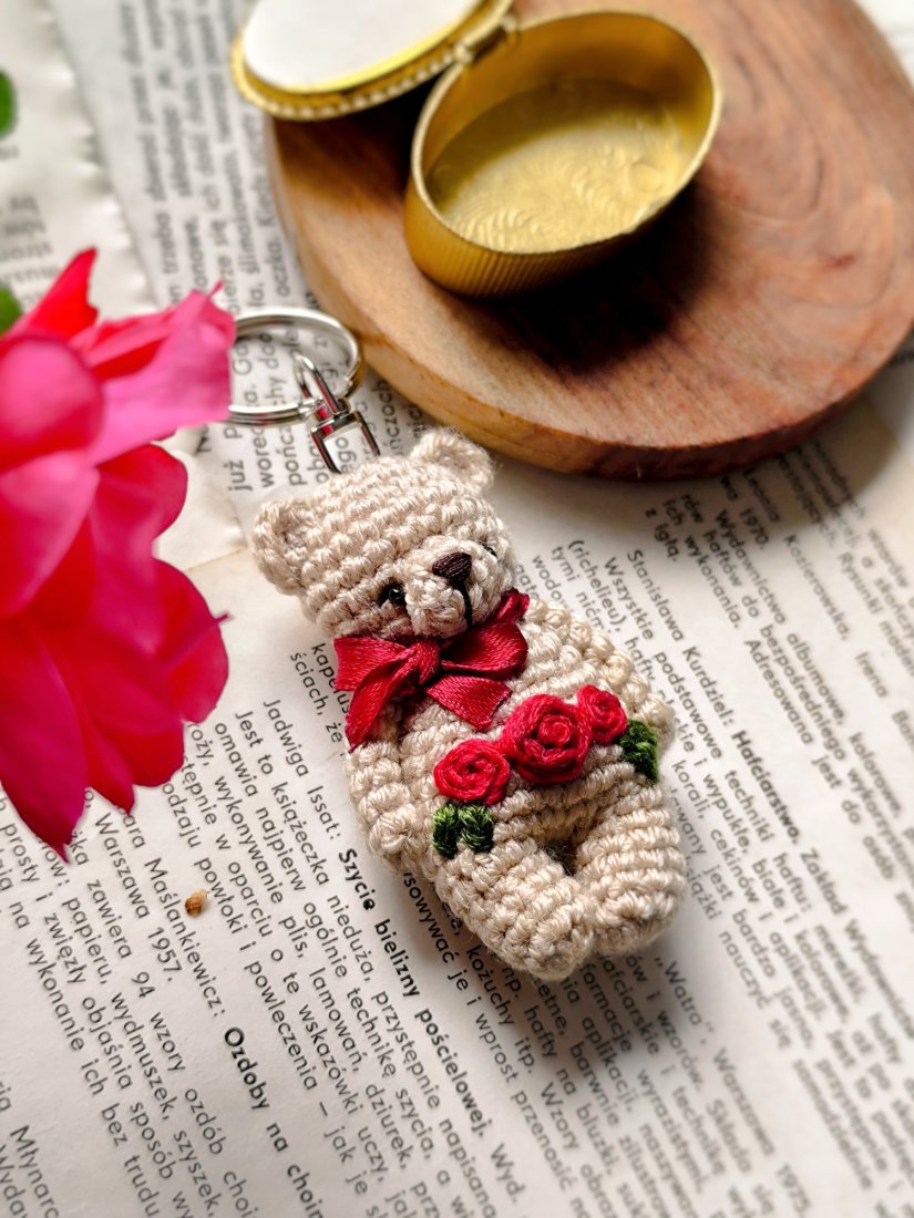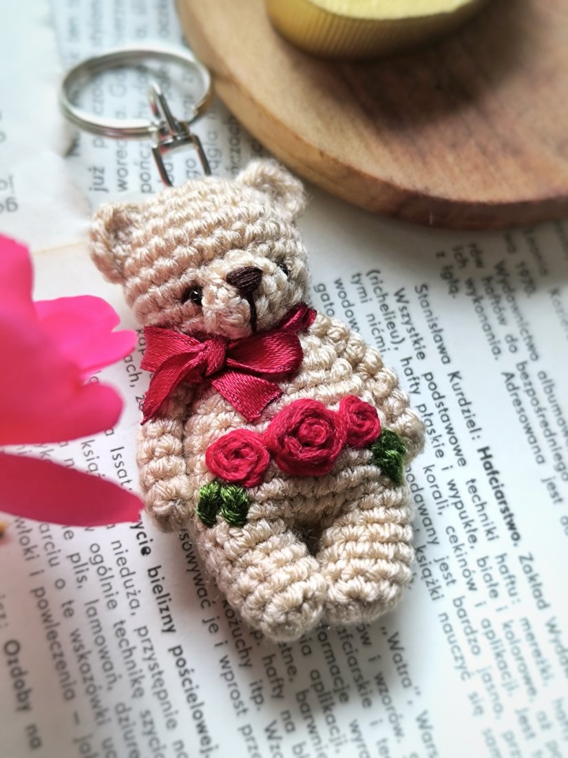 Bordo Rose to mały miś pod postacią breloczka. Mierzy ok. 6 cm plus elementy metalowe. Ta urocza (i praktyczna!) ozdoba, została wykonana ręcznie na szydełku.