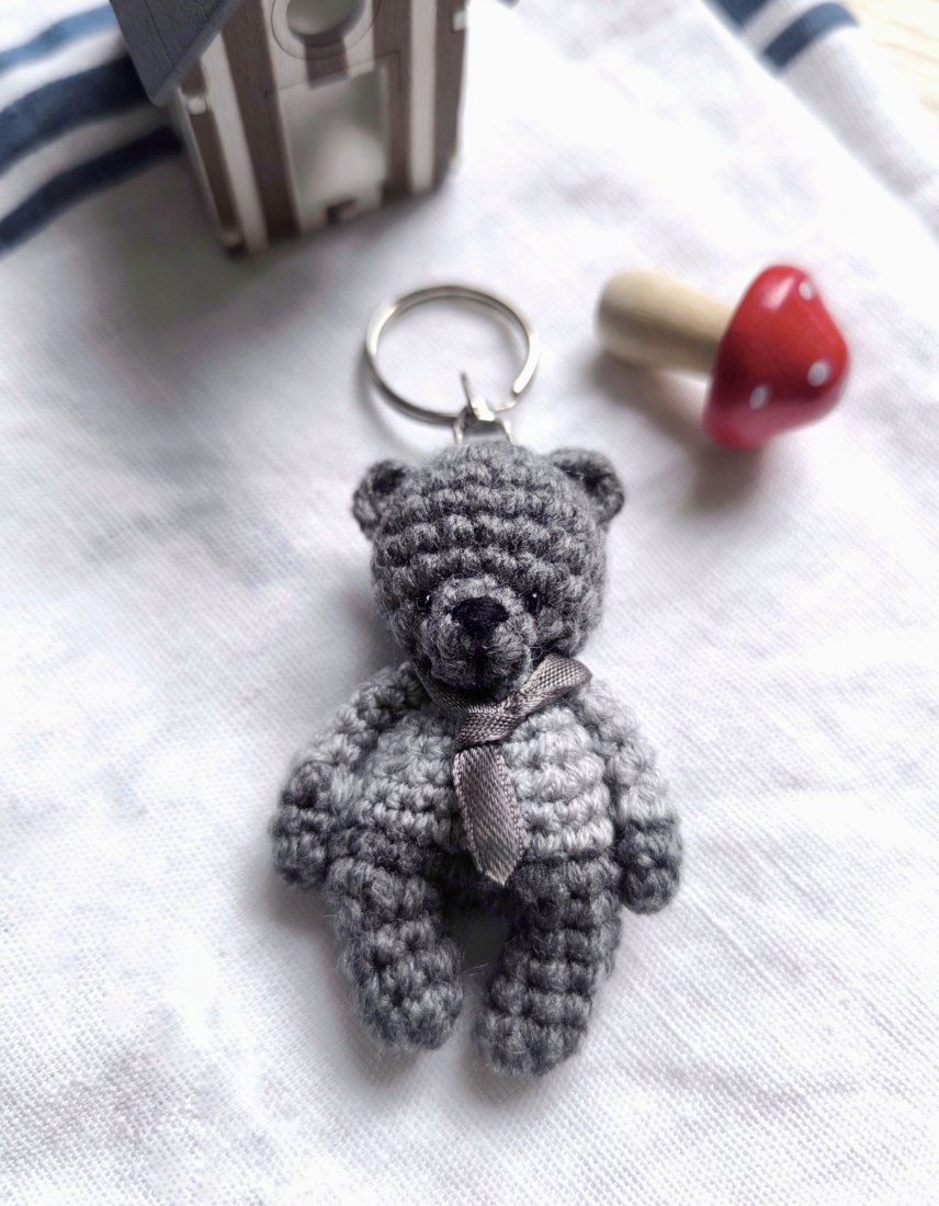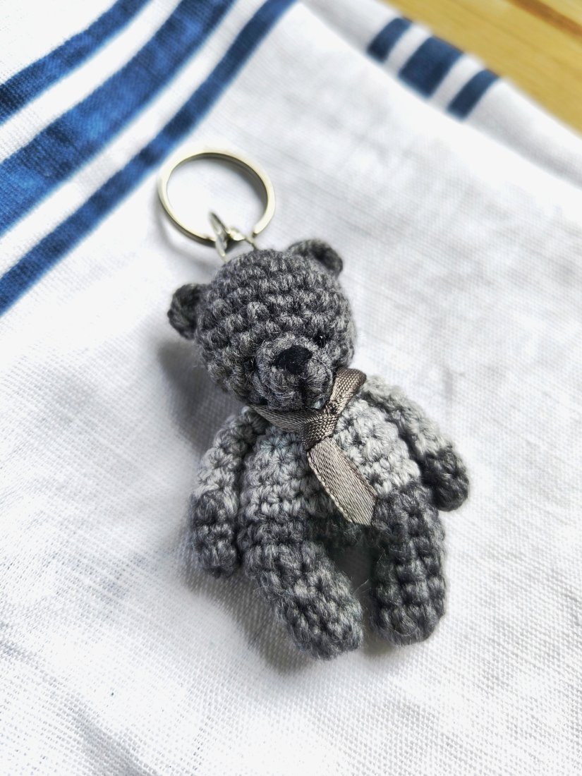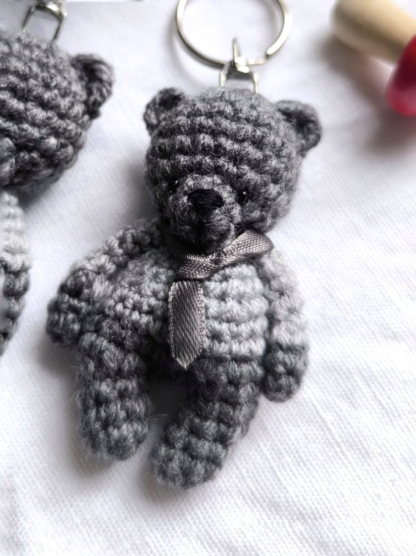 Greyman to mały miś pod postacią breloczka. Mierzy ok. 6 cm plus elementy metalowe. Ta elegancka (i praktyczna!) ozdoba, została wykonana ręcznie na szydełku.