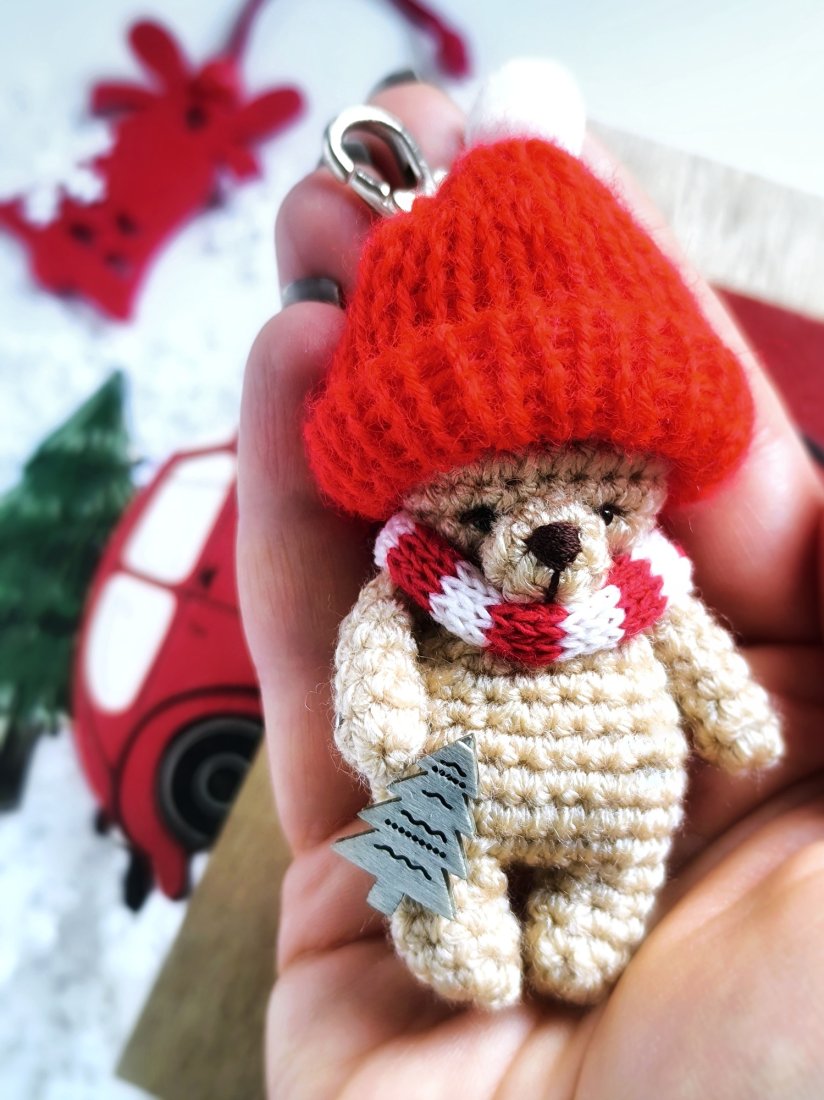 Jest to breloczek, zamocowany na karabińczyku, który posiada element obrotowy. Dzięki temu swobodnie obkręcisz go po przypięciu np. do torebki. W zestawie czerwona tasiemka, by można przewlec ją przez karabińczyk, zawiązać i zawiesić na choince. Miś ma czerwoną czapkę zamocowaną na stałe i komin w biało czerwone paski. Dekoruje go drewniana choinka w kolorze szarym.