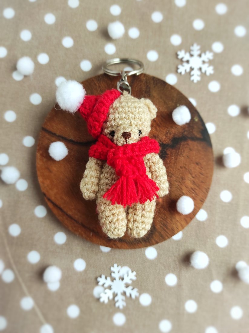 Prezentowany na zdjęciach miś to 100% rękodzieło. Spełnia funkcję breloczka. Można go też zawiesić na choince. Wykonany na szydełku z akrylowej włóczki a jego zamocowane na stałe dekoracje (czapka i szaliczek) są z czerwonej włóczki bambusowej.