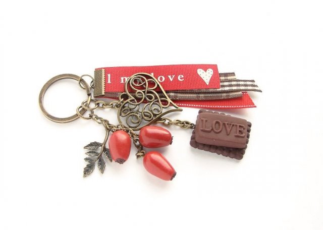 Śliczny breloczek w kolorze starego złota z owocami dzikiej róży i czekoladką z napisem love oraz dużym metalowym serduszkiem i kolorowymi tasiemkami. Zawieszki zostały wykonane ręcznie z masy fimo. Idealny prezent na walentynki :)