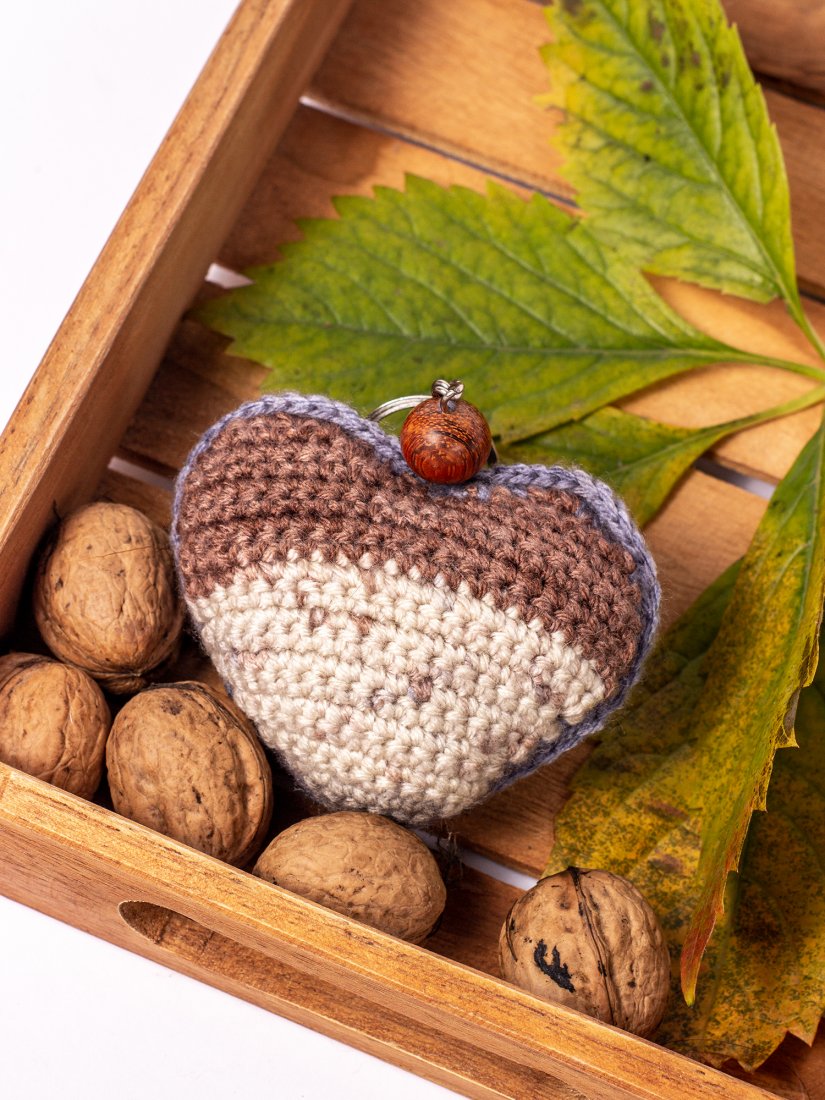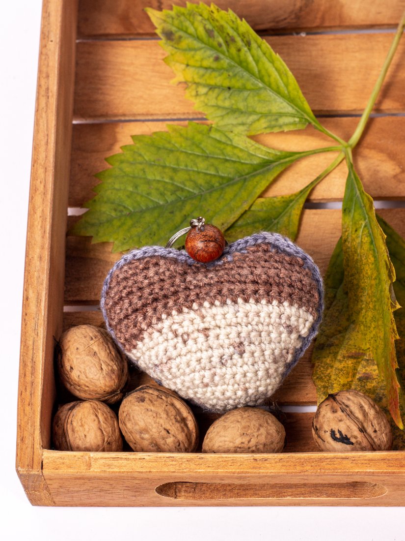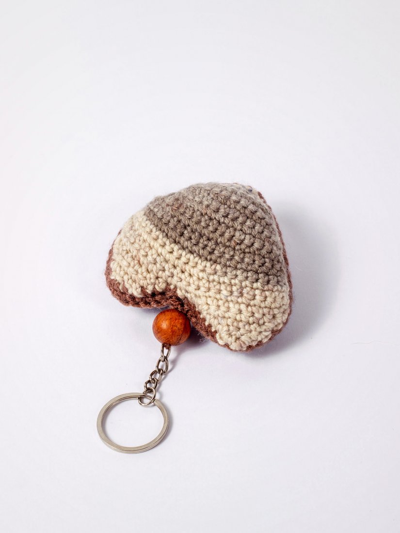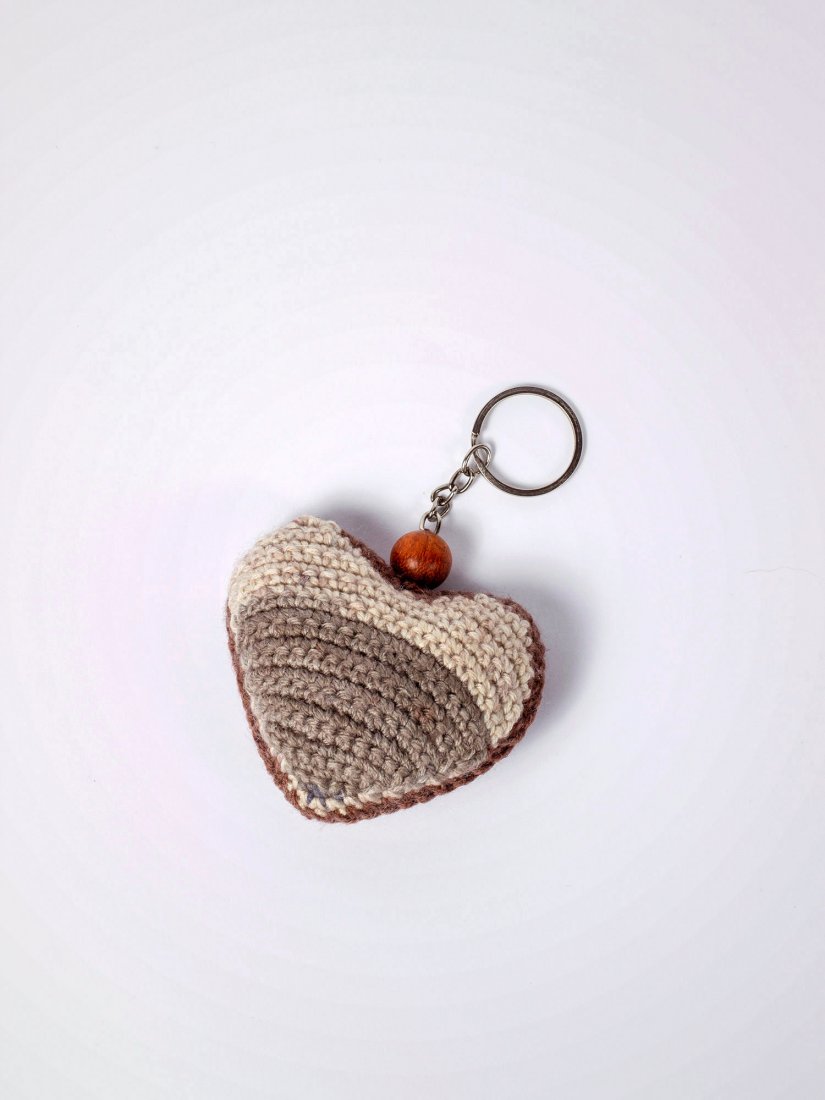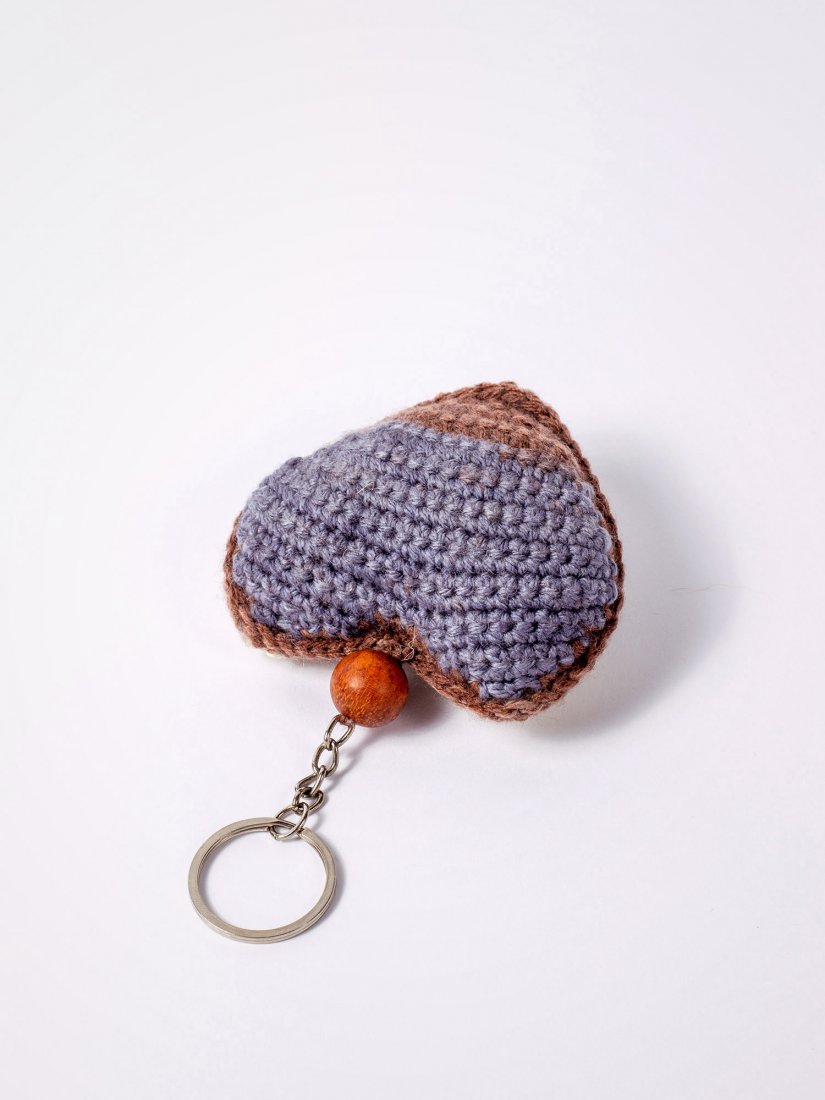 Breloczek składa się z metalowego kółka z łańcuszkiem oraz serduszka wykonanego na szydełku z włóczki oraz koralików. Nadaje się do prania ręcznego w 30 st.