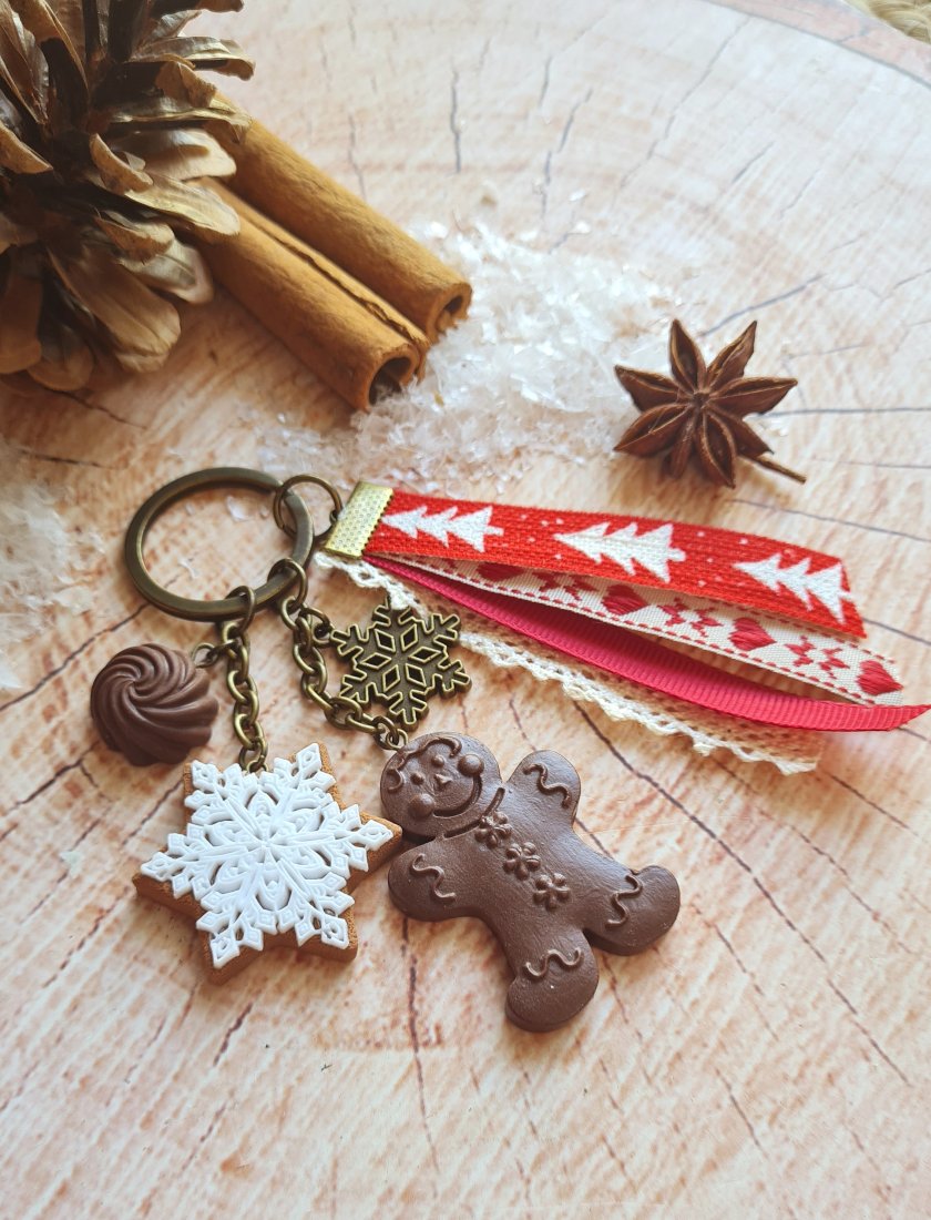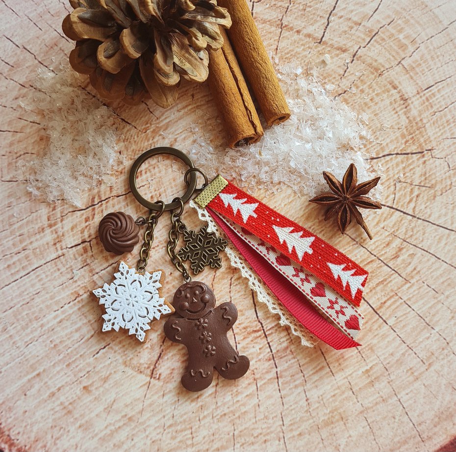 Słodki świąteczny breloczek do kluczy lub torebki z dużym czekoladowym ludkiem, małą pralinką i pierniczkiem świątecznym wykonanymi ręcznie z masy termoutwardzalnej fimo oraz metalową śnieżynką i kolorowymi wstążeczkami.