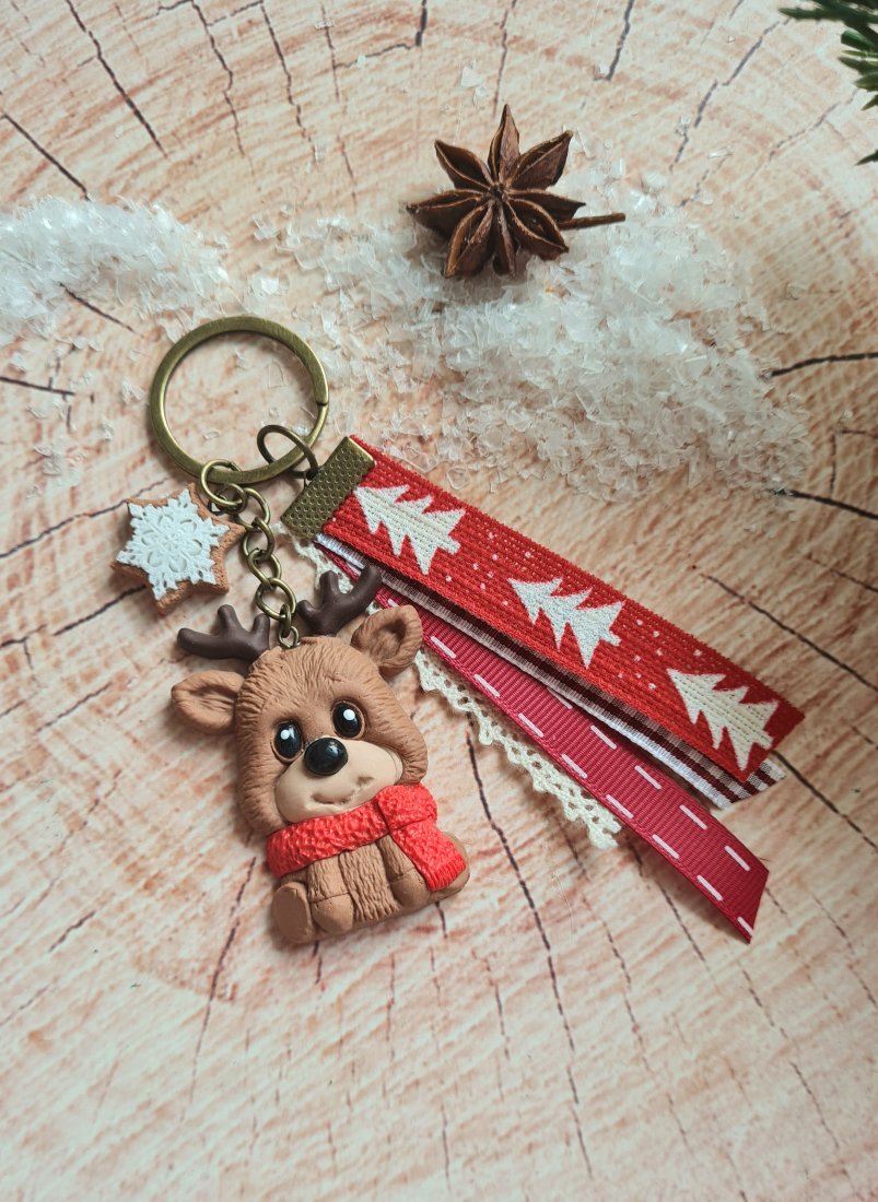 Słodki świąteczny breloczek do kluczy lub torebki ze świątecznym reniferkiem i małym pierniczkiem ze śnieżynka wykonanymi ręcznie z masy termoutwardzalnej fimo, całość ozdobiona kolorowymi wstążeczkami.