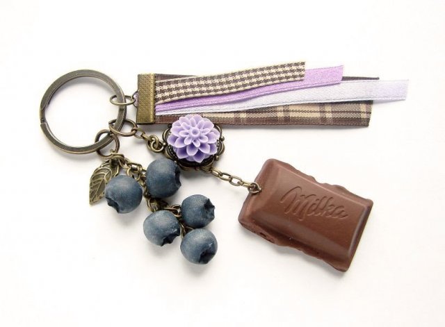 Słodki breloczek do torebki/ kluczy z kawałkiem czekolady milka i pysznymi jagodami, kwiatkiem z żywicy oraz kolorowymi tasiemkami. Zawieszki wykonane ręcznie z masy termoutwardzalnej fimo.