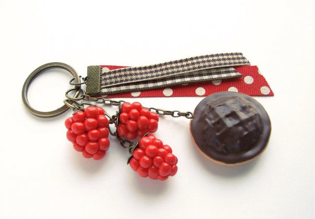Słodki breloczek do kluczy/ torebki z pyszną czekoladową delicją i słodkimi malinkami wykonanymi ręcznie z masy termoutwardzalnej fimo, kolorowymi tasiemkami i elementami metalowymi w kolorze starego złota