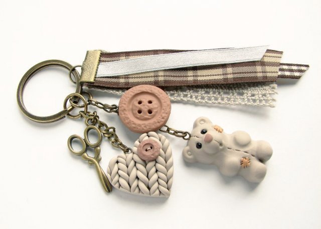 Uroczy breloczek do kluczy/ torebki z szarym misiem, sweterkowym serduszkiem, guzikiem i tasiemkami. zawieszki wykonane zostały ręcznie z masyfimo