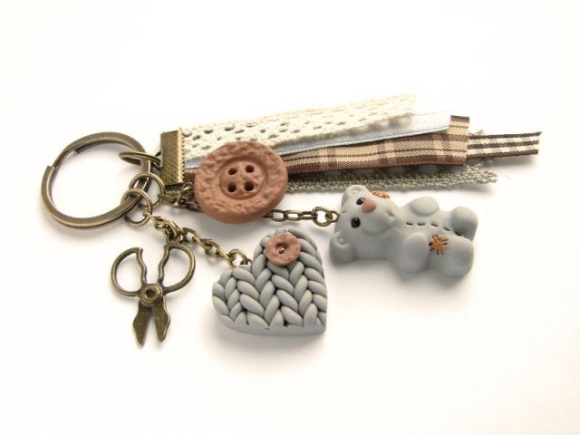 Uroczy breloczek do kluczy/ torebki z szarym misiem, sweterkowym serduszkiem, guzikiem i tasiemkami. zawieszki wykonane zostały ręcznie z masyfimo
