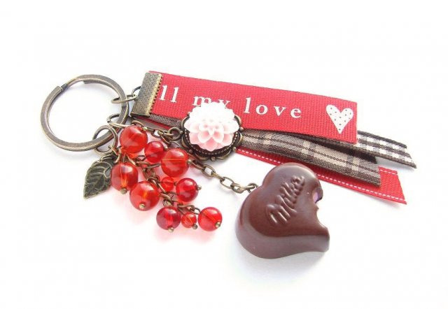 Śliczny breloczek w kolorze starego złota z czekoladką milką sercem wykonaną z fimo, porzeczkami ze szklanych czerwonych koralików, kwiatkiem z żywicy i kolorowymi tasiemkami.