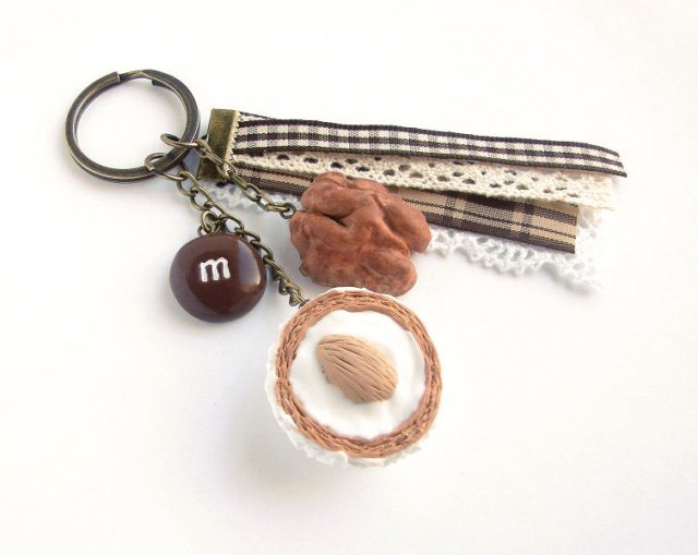 Słodki breloczek do kluczy/ torebki z pysznym Rafaello, orzeszkiem włoskim, cukierkiem m&m i ozdobnymi tasiemkami. Zawieszki wykonane zostały ręcznie z masy termoutwardzalnej fimo