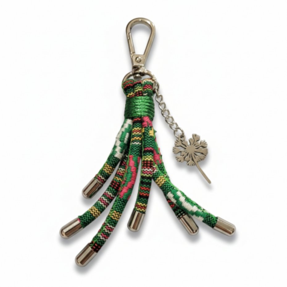 Brelok wykonany w stylu boho z kawałków szytego rzemienia bawełnianego (śr. 4mm), z tkaniny o wyraźnym splocie i zawieszki ze stali szlachetnej w kształcie dmuchawca o wym. 3 x 1,8cm.