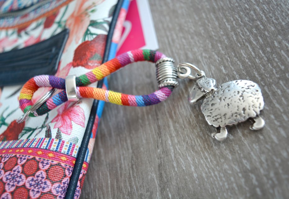 Uroczy, multikolorowy brelok do kluczy w stylu boho wykonany z szytego rzemienia materiałowego/bawełnianej liny materiałowej o średnicy 6mm (z tkaniny o wyraźnym splocie) oraz elementów cynowych wytworzonych w UE. Ozdobę breloka stanowi cynowa zawieszka w kształcie owieczki (35x40mm).